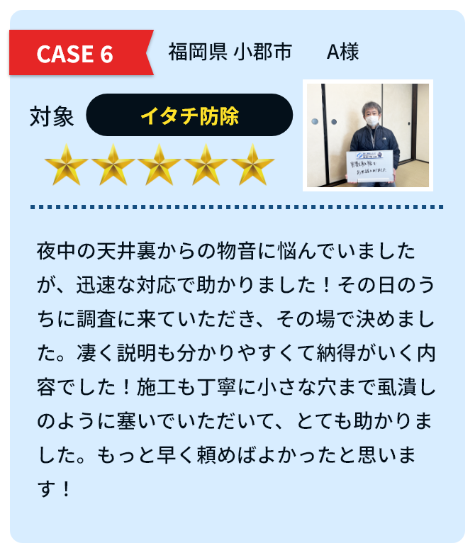 本格的な駆除や対策は1~4日で終わるはずがありません。弊社は時間をかけ1ケ所1ケ所侵入口を確実に塞いで行きます。数日で終わる業者の多くは見落としに繋がり高い確率で再発します。最悪な場合、追加料金にを取られてしまう可能性があります。